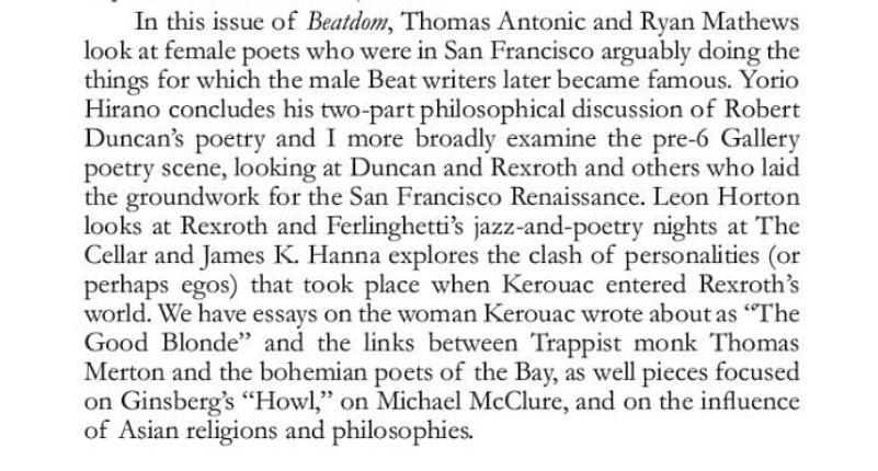 That’s pretty heady stuff. To mark the historic event Wills has published the 25th issue of Beatdom: The San Francisco Renaissance, a 240+ page volume chock full of essays, poetry, memoirs, and a book review.