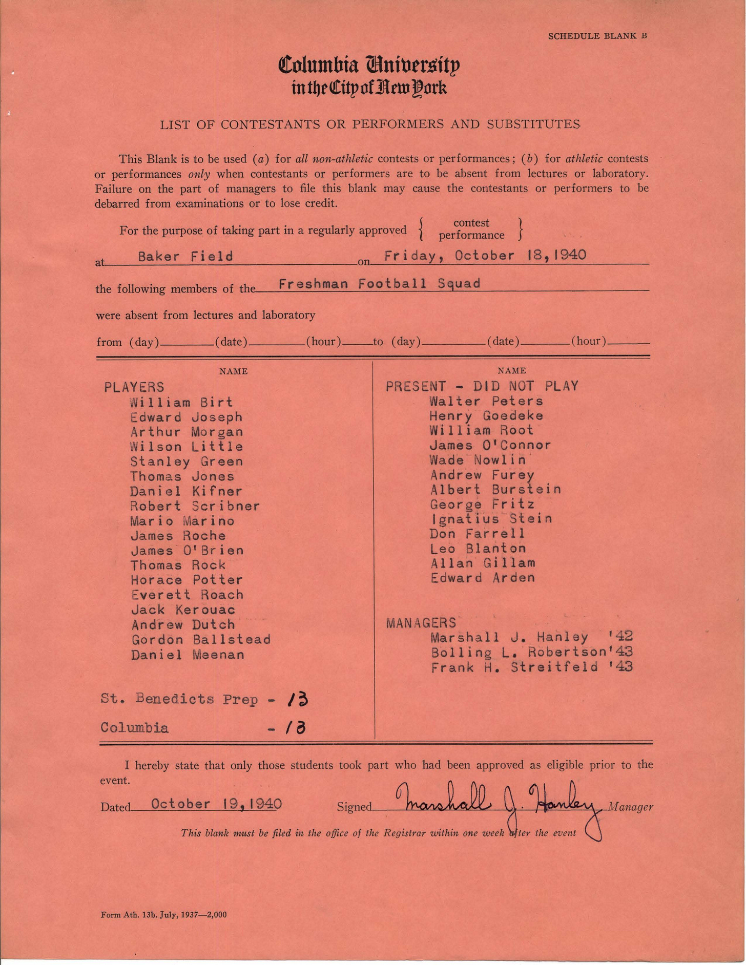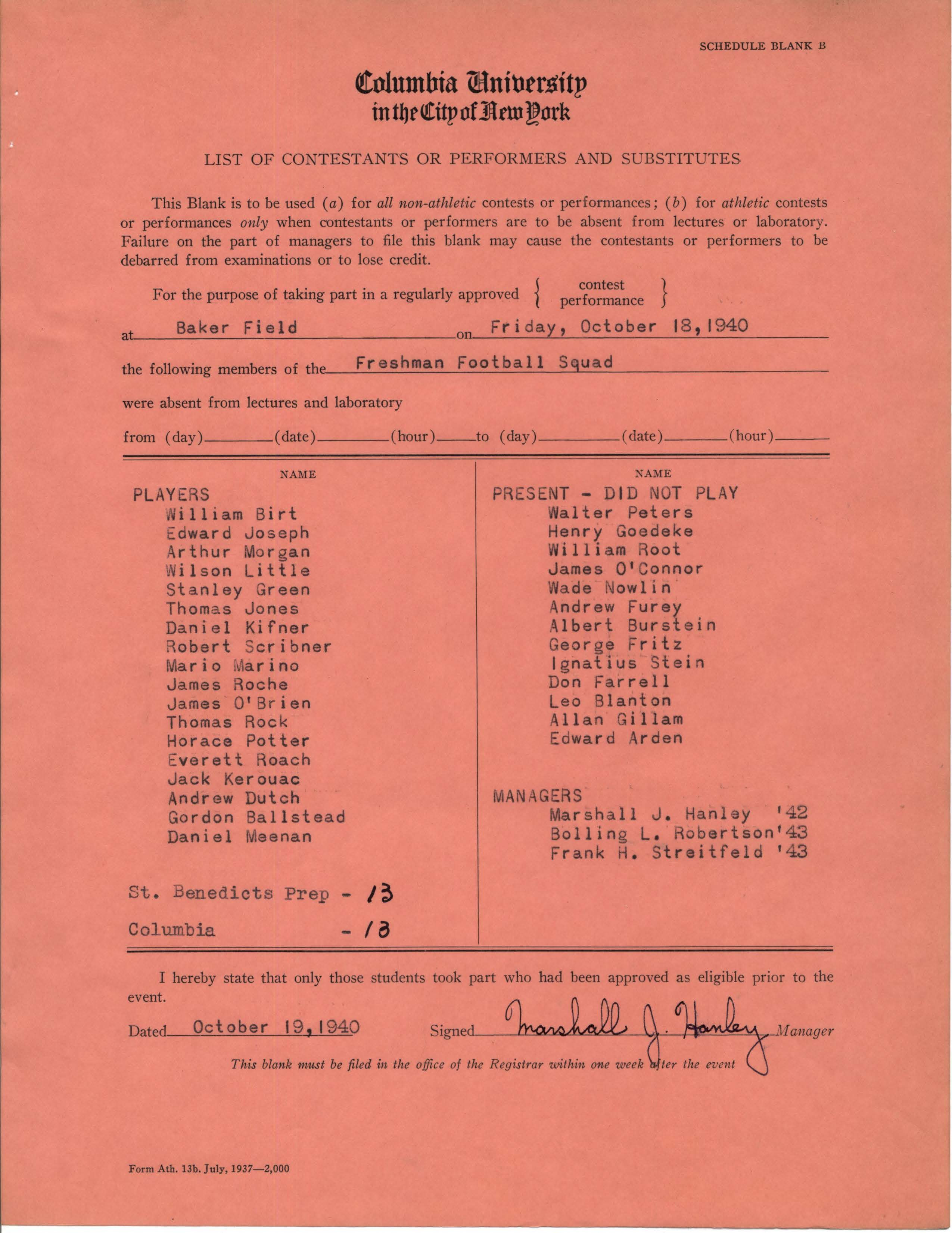 In the fifth game of the 1938 season, he scored two touchdowns for the Red and Grey squad in a 43-0 victory over Keith Academy. It was this game, according to Kerouac, that he drew the attention of major college recruiters, including Frank Leahy, coach at Boston College. (Leahy would go on to coach Notre Dame, 1941-1943, 1946-1953).